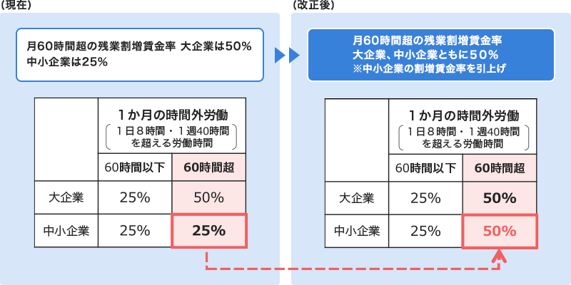 1 令和5年4月1日から、中小企業について、月60時間超の残業の割増賃金率が50%に引き上げられています。大企業については、既に平成22年4月1日から50%に引き上げられています。