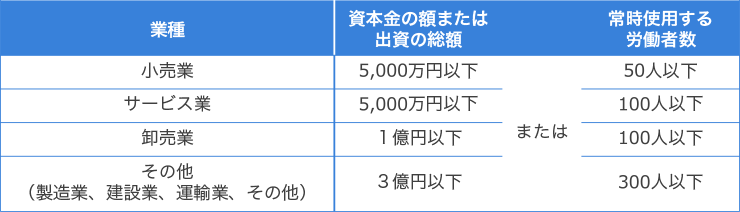 中小企業の範囲については、「資本金の額または出資の総額」または「常時使用する労働者の数」のいずれかが以下の基準を満たしていれば、中小企業に該当すると判断されます。事業場単位ではなく、企業単位で判断されます。